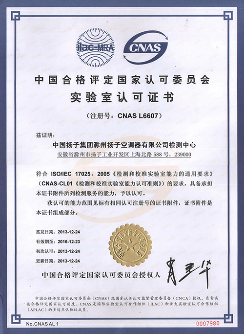 近日,中国扬子集团滁州扬子空调器有限公司检测中心收到中国合格评定国家认可委员会(CNAS)实验室认可证书,该实验室符合ISO/IEC 17025:2005《检测和校准实验室能力的通用要求》(CNAS-CL01《检测和校准实验室能力认可准则》)的要求,具备承担按相应认可准则提供检测服务的能力,予以认可。