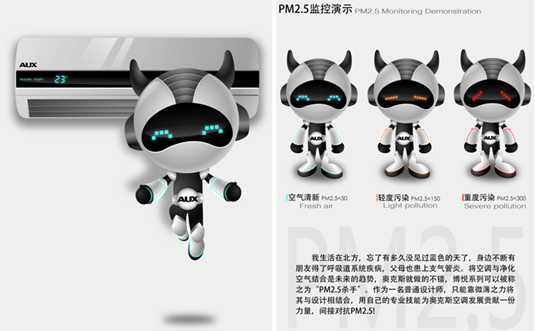 据主办方介绍,奥克斯空调卡通形象全球征集大赛共收到500余幅来自一流设计师的高质量作品,并在评委的专业审评及网友的积极投票下,最终诞生了奥克斯空调卡通形象的代言人——“智慧牛”。该作品以其十足的科技感将空调的智能化与“牛”的形象巧妙地融合,彰显了奥克斯空调的品牌内涵;该机器小牛更是具有“PM2.5监控功能“,这与奥克斯空调产品独具的对抗PM2.5的功能相得益彰,由此获得评委和网友一致好评。