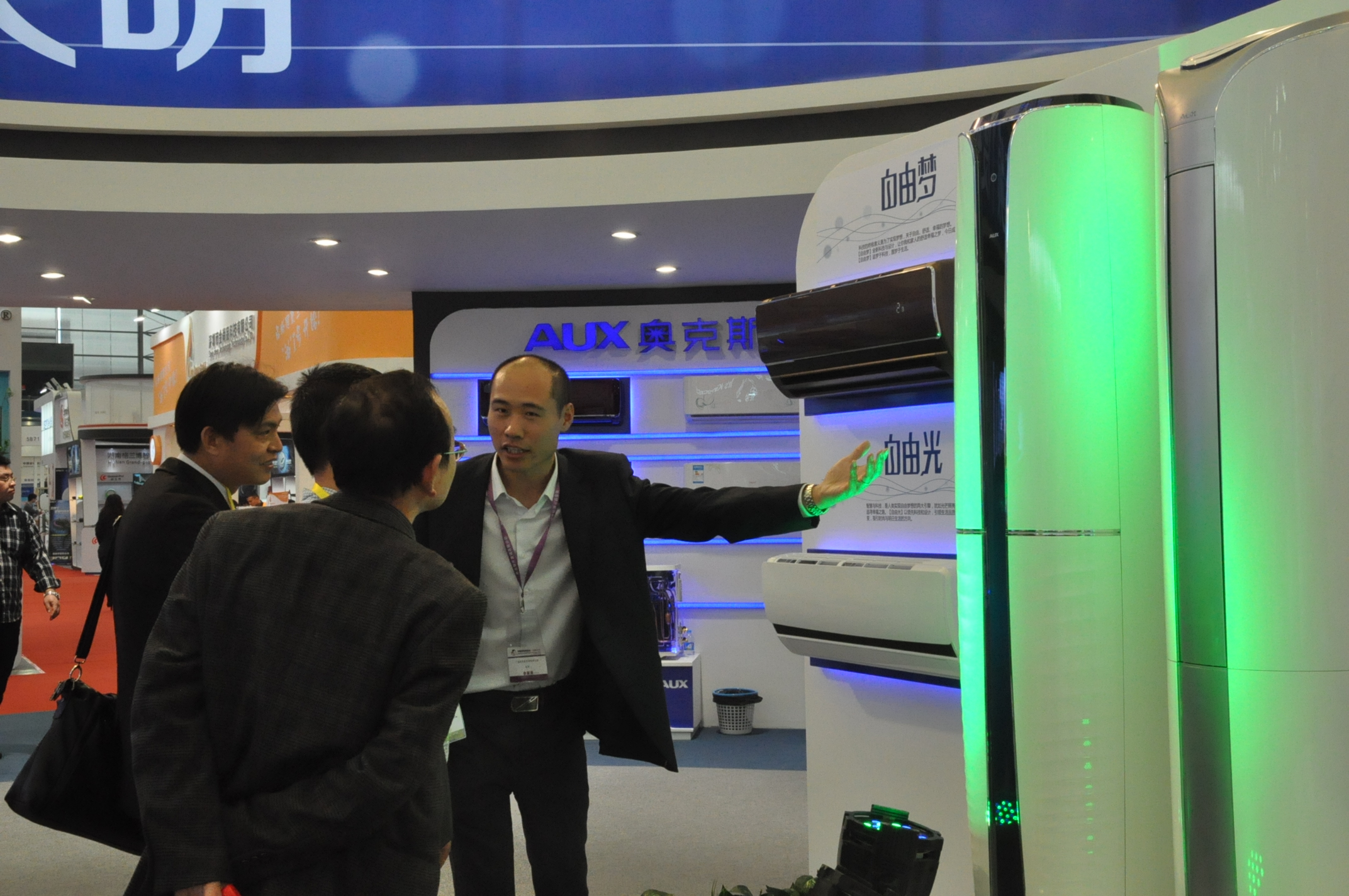 AWE现场工作人员向消费者介绍奥克斯“自由光”、“自由梦”系列空调
