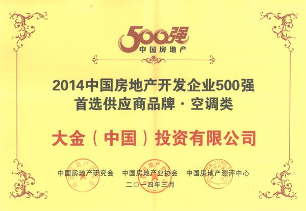 大金以超群的综合实力蝉联 “2014中国房地产开发企业500强首选供应商·空调类”榜首,再次获得由中国房地产研究会、中国房地产业协会和中国房地产测评中心联合颁发的“2014中国房地产开发企业500强首选供应商”荣誉证书。这也是大金自2009年首届评选至今连续五年获得空调类榜首的荣誉。
