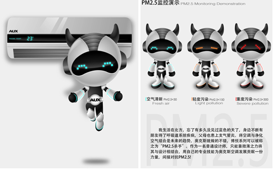 近年来,由于极具亲和力的卡通形象是能够跨文化地突显企业特色、拉近企业与消费者距离的绝佳途径,越来越多的企业启动了卡通形象营销的策略。据主办方介绍,奥克斯空调卡通形象全球征集大赛共收到500余幅来自一流设计师的高质量作品,并在评委的专业审评及网友的积极投票下,最终诞生了奥克斯空调卡通形象的代言人——“智慧牛”。该作品以其十足的科技感将空调的智能化与“牛”的形象巧妙地融合,彰显了奥克斯空调的品牌内涵;该机器小牛更是具有“PM2.5监控功能“,这与奥克斯空调产品独具的对抗PM2.5的功能相得益彰,由此获得评委和网友一致好评。