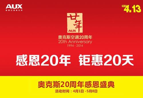 4月13日,奥克斯空调将迎来企业20周年庆典,在线上线下共推出十几种活动,将重心完全放在“感恩消费者”的主题上,为消费者打造一个真正的“感恩20年 钜惠20天”感恩消费季。