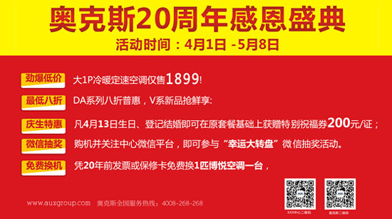 据了解,本次奥克斯空调20周年感恩庆典单是在线下各门店就有五大活动——大1匹冷暖定速空调仅1899,DA系列八折优惠、V系列新品抢先享,购机即可参加微信“幸运大转盘”抽奖,凭20年前发票或保修卡可免费换1匹博悦空调一台,更有4月13日生日、登记结婚的消费者可获赠200元祝福券。