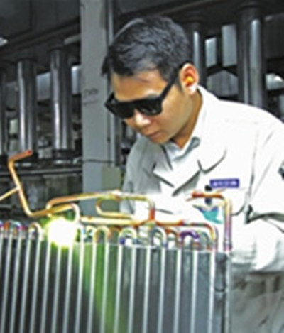 焊枪火焰温度最低2300度,最高可达2800度,一台空调机4个焊点,一天流水线焊接2000到3000台空调,一万多个焊点,焊漏率低于3%。这就是王玉俊所在生产线一直保持的生产标准。1985年出生的王玉俊虽然年纪不大,但已经是海尔集团空调供应链首席技师,同时具有钎焊工种技师资格,获得集团“空调供应链首席技师焊接大赛总冠军”等多个荣誉。