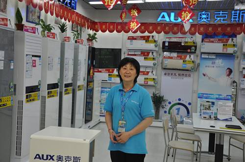 我在苏宁电器奥克斯柜台找到刘慧英时,她正在向顾客介绍奥克斯空调线上的最新空调产品,当顾客离开后,刘慧英很有礼貌的和我打了招呼,“同事们都怎么称呼您?”“他们都叫我大姐,哈哈”,刘慧英说。就这样,和这位奥克斯空调大姐的聊天开始了。