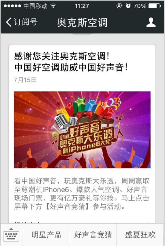 7月14日奥克斯空调为第三季《中国好声音》量身定制的超级大竞猜“奥克斯大乐透”拉开帷幕!很快,腾讯、易信都做出反应,放出了自己的有奖游戏,三大活动齐撞车!.jpg)