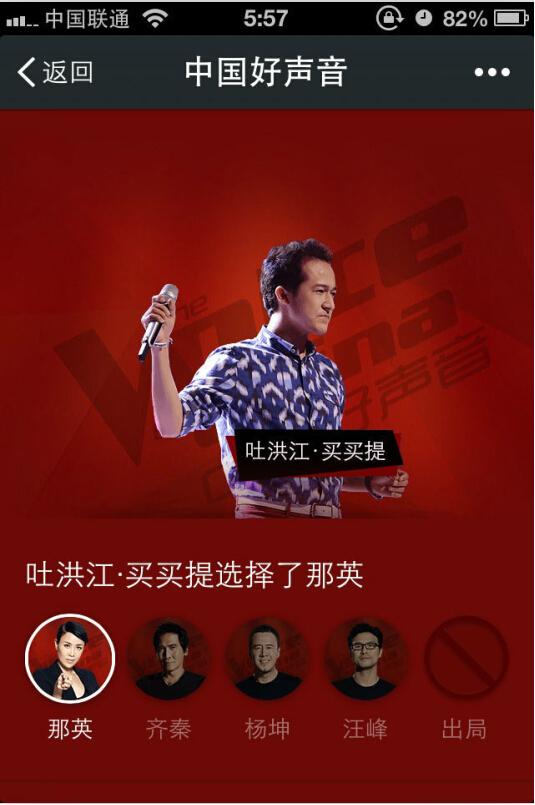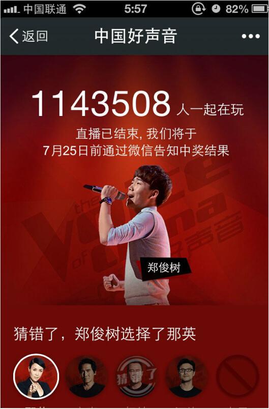 腾讯这边推出的是电视直播竞猜,在手机游戏界面可以看到正在实时演唱的学员,而下方则是四位导师的头像,网友可以根据学员表现实时竞猜其是否能得到导师转身、最终又将选择哪位导师,猜中者有机会获得奖品。缺点是游戏时间集中,只能在好声音开赛后1-2小时内参与。由于比赛已经开始,加上腾讯作为独家网络直播方,放出很多实时快讯,因此冲淡了竞猜游戏本身应有的悬念,不免有些缺憾。