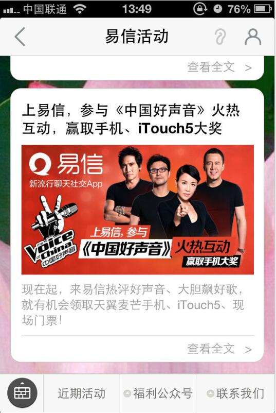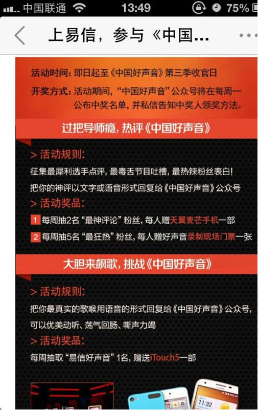 相对奥克斯和腾讯推出的有奖竞猜,易信活动的推出速度稍有点慢。玩法是要求玩家在平台留下神点评,或者发送自己的歌声片段到手机易信公众号平台,从中抽选幸运者获得天翼麦芒手机、好声音门票或iTouch5。纯粹的碰运气玩法,没有任何悬念和技术含量,还会让人觉得有点麻烦,参与热情不高。