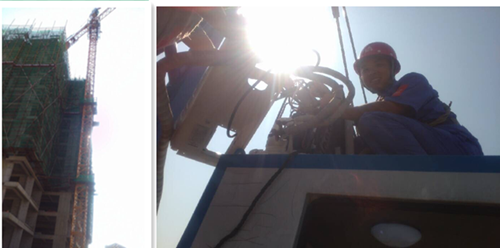 顶住40度高温酷暑的考验,陈正站在70多米的高空塔式起重机上修空调