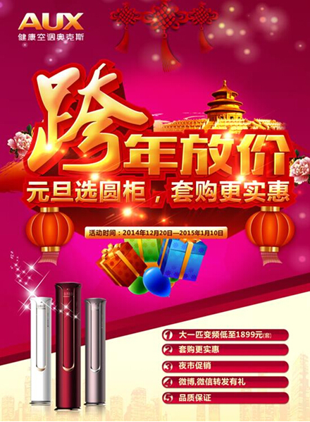 想要购实惠,买空调,从12月25日开始,奥克斯的新品系列柜机,就会以惊爆价5999元回馈消费者,并且从12月25日开始一直延续到1月20日,1月20日以后将恢复原有价格。除此之外,为全面的回馈用户,奥克斯空调还会推出夜间专场,转发就有豪礼相送的各种有奖互动活动,让您在元旦假期买的放心,买的开心。感兴趣的朋友还在等什么,赶紧抢起来吧~