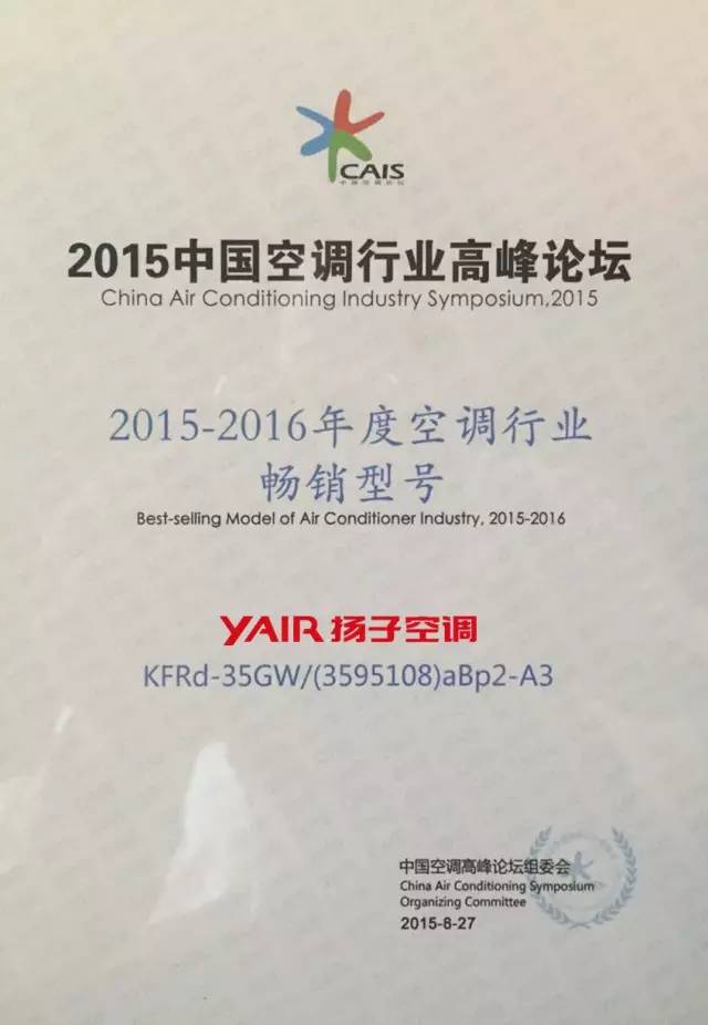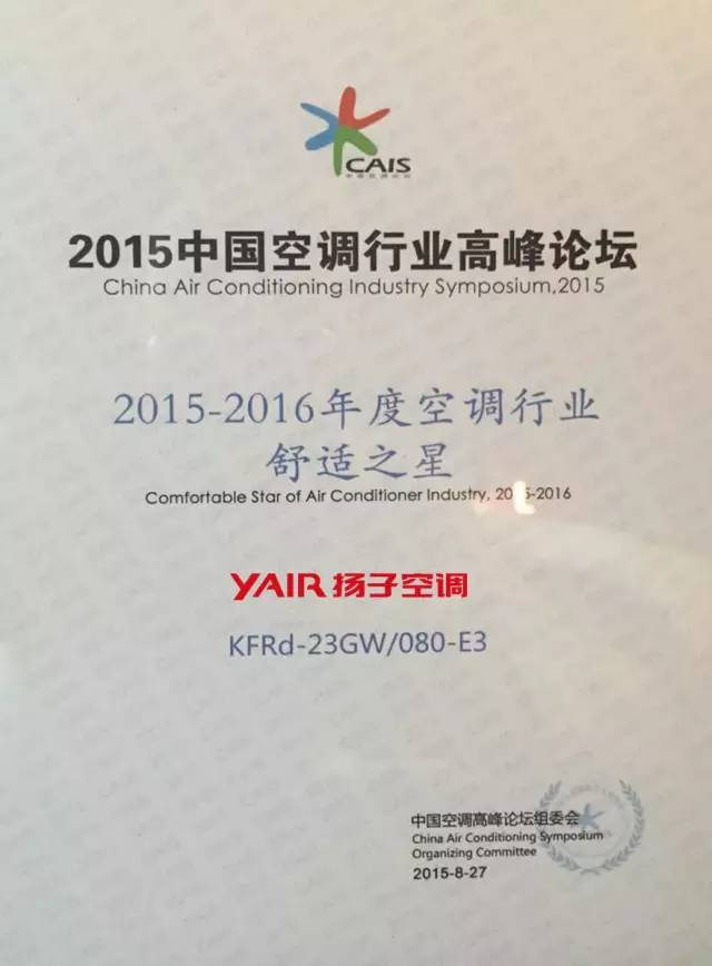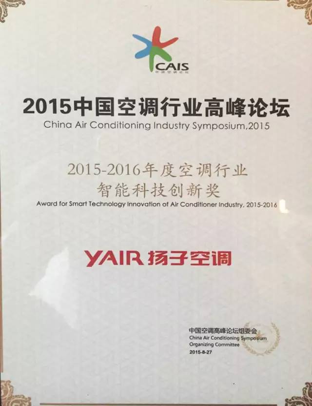 2015年8月27日,在由中国家电协会和国家信息中心信息资源开发部指导、中国家电网举办的2015中国空调行业高峰论坛上,空调行业向扬子空调颁发了“2015-2016年度空调行业智能科技创新奖”、“2015-2016年度空调行业舒适之星”、“2015-2016年度空调行业畅销型号”三大奖项,以表彰扬子空调在行业中所作出的贡献。