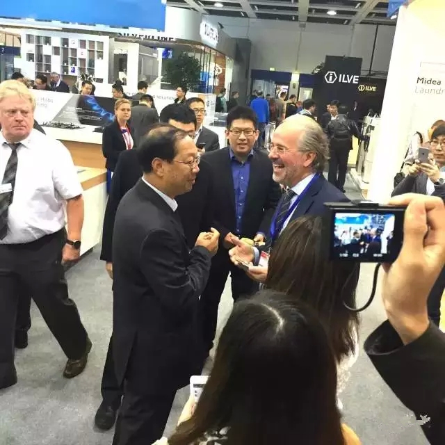 9月6日,中国驻德国特命全权大使——史明德来到IFA展美的展馆,与德国营销分公司总经理Michael Habla亲切交谈,并肯定了美的在德国的发展。