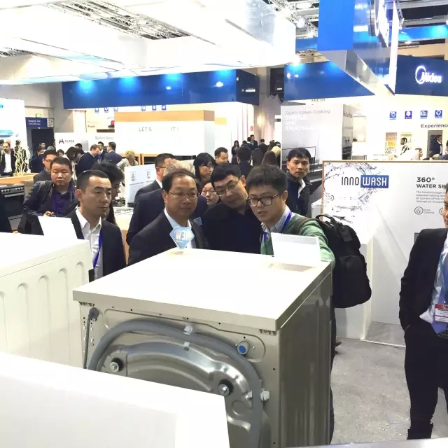 大使(右三)在听市场人员介绍高端洗衣机BEVERLY智能产品。