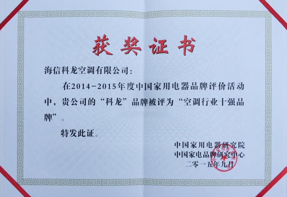 9月17日,2014-2015年度中国家用电器行业品牌评价结果发布会在北京举行,科龙空调凭借较高的品牌知名度,智能、时尚的品牌认知,获评“2014-2015年度中国家电行业十强品牌”。