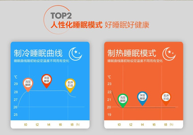 在该模式下,根据睡眠前空调所设置的模式温度,空调器的微电脑会自动做出判断,并按系统预设的“温度-时间”数据库运行,全面呵护睡眠温度!